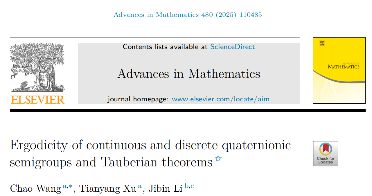 近期,数学与统计公司王超教授团队再次在国际数学著名期刊《Advances in Mathematics》(数学进展)上发表题为《Ergodicity of continuous and discrete quaternionic semigroups and Tauberian theorems》的学术论文。该篇文章是王超教授及其博士生徐天阳与浙江师范大学李继彬教授合作完成。