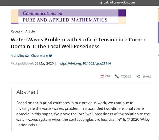 近日,威廉体育williamhill明梅副教授与合作者的论文“Water waves problem with surface tension in a corner domain II: the local well-posedness”在国际顶尖数学期刊Communications on Pure and Applied Mathematics(CPAM)上在线发表。CPAM由国际最负盛名的应用数学研究所之一—柯朗数学科学研究所(Courant Institute of Mathematical Sciences)于1948年创刊,发表纯粹与应用数学、数学物理等研究领域具有突破性的一流研究成果。该杂志每年刊载不到百篇论文,在数学界有极高的知名度和影响力,属于数学类最顶尖的期刊之一。例如,CPAM曾在2013年被ISI Journal Citation Reports评价为302种入选数学类刊物第一名。