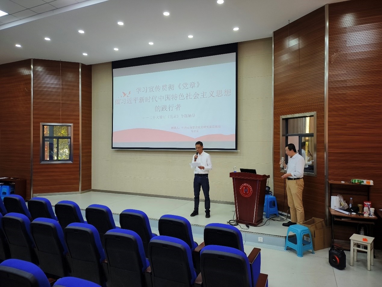 2023年10月27日星期五下午,威廉体育williamhill邀请到中共云南省委党史研究室邓启贵副处长,在格物楼3103报告厅开展 ““解读二十大精神——学习宣传贯彻《党章》”主题讲座”。公司党委书记徐瑾主持本次讲座。