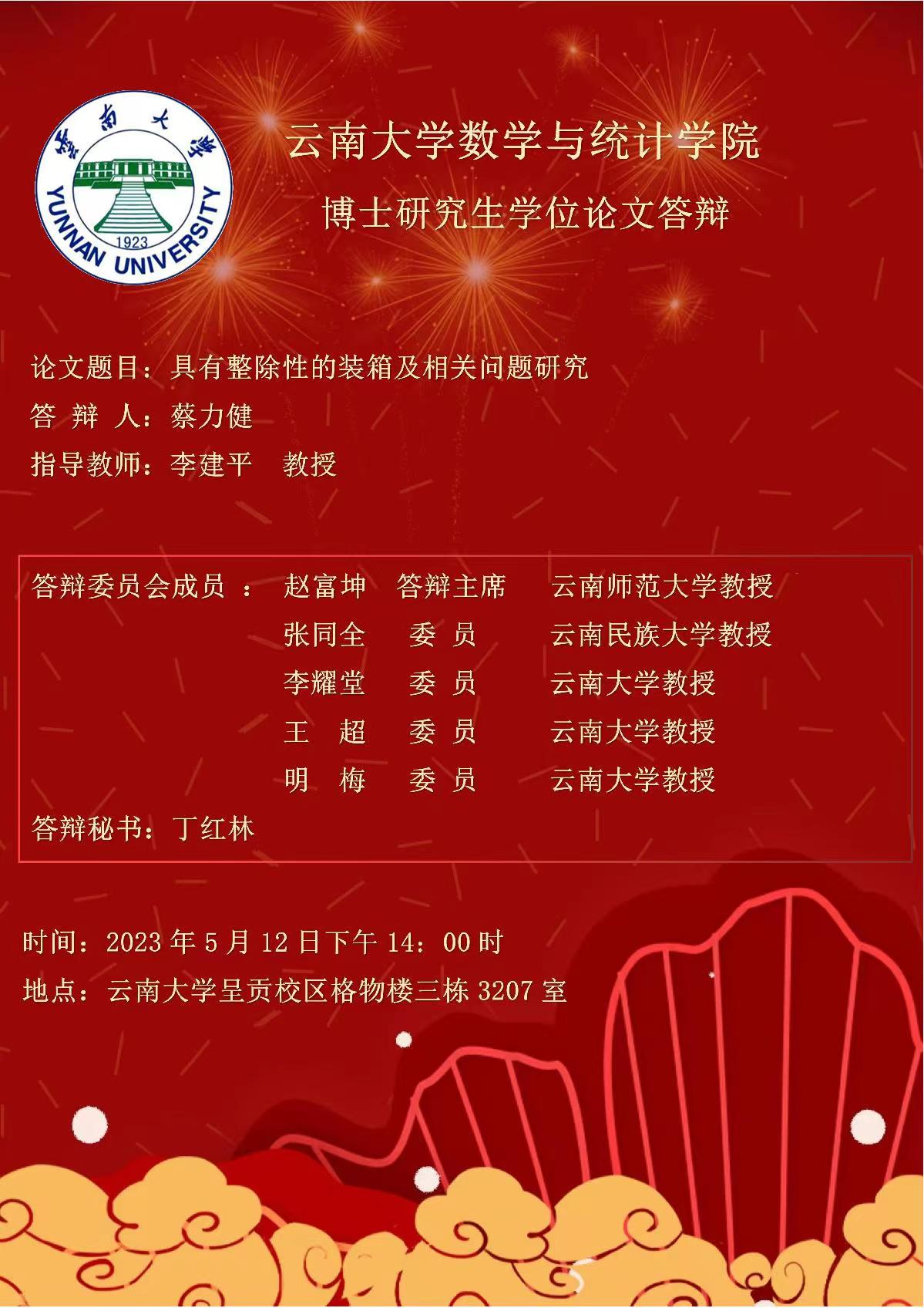 威廉体育williamhill 博士研究生学位论文答辩:具有整除性的装箱及相关问题研究,答辩人:蔡力健