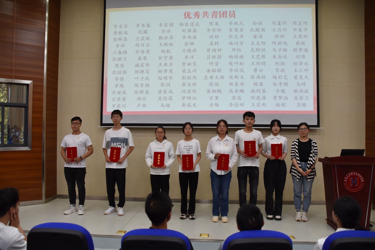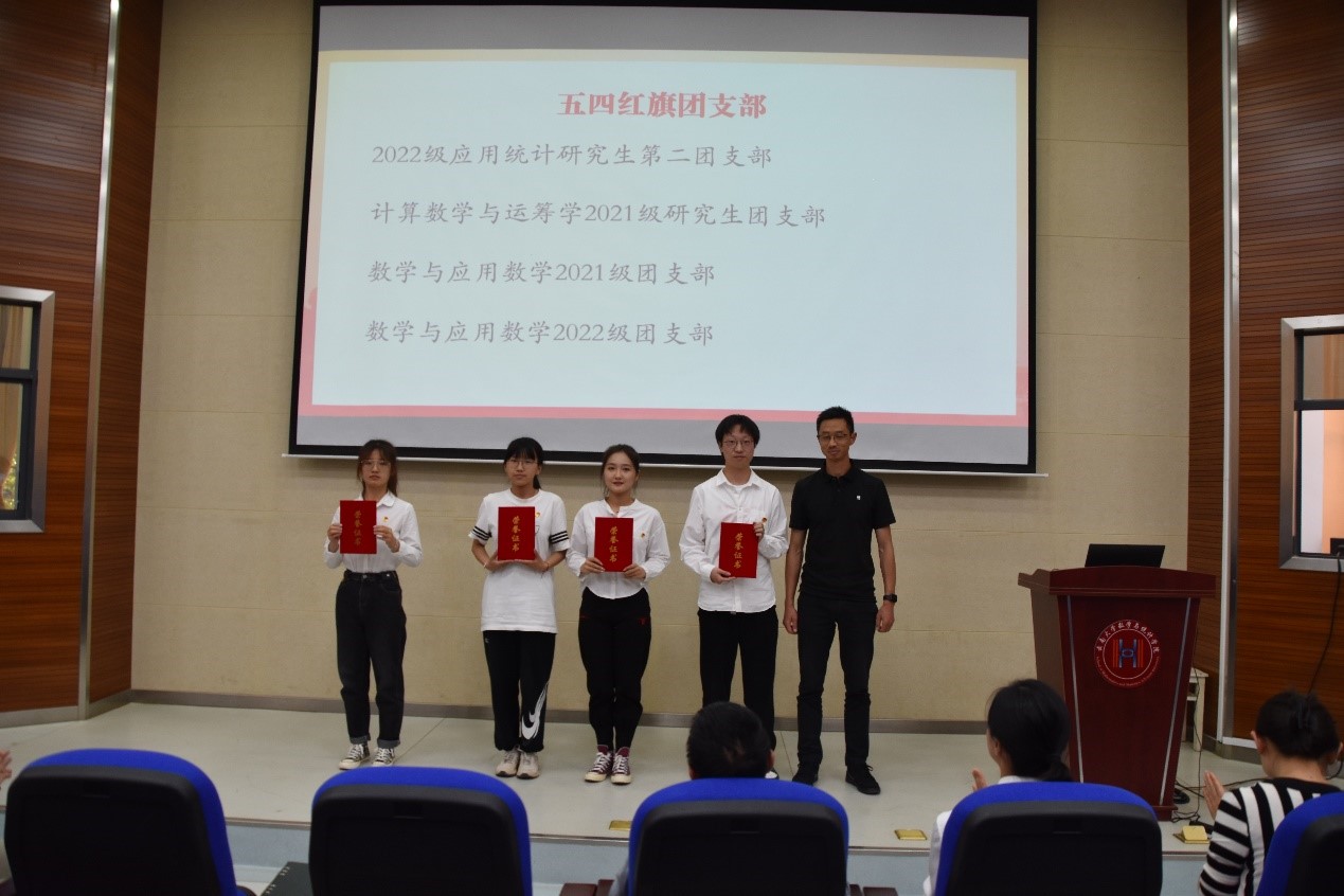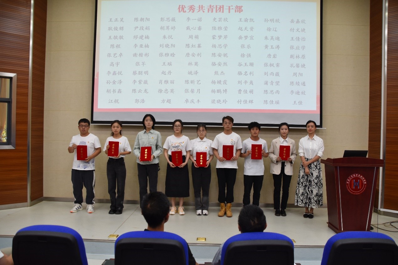 第五项议程:颁奖环节。为表彰先进,宣传先进,激励全院青年、团员、团干部和组织奋发有为、再创佳绩,公司团委决定授予2022级应用统计研究生第二团支部等4 个团支部“红旗团支部”称号,授予陈朝阳等8位同学“先进工作者”称号,授予王正昊等74位同学“优秀共青团干部”称号,授予李京京等114位同学“优秀共青团员”称号,授予吴婉婷等22位同学“学业进步奖”称号,授予苏宇杰等75位同学“优秀毕业生”称号,授予马子璇等60位同学“优秀青年志愿者”称号,授予3个志愿团队“优秀志愿服务团队”称号。各获奖代表依次上台领奖。