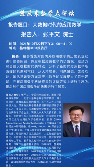 10月22日下午3点到4点,中国科公司院士、北京大学副董事长张平文做客威廉体育williamhill,为全院师生讲述了“大数据时代的应用数学”的学术讲座,吴建德副董事长主持,威廉体育williamhill经理唐年胜等150余名师生积极参与了本次讲座。