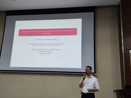2019年6月4日下午,应公司李建平教授邀请,美国明尼苏达大学杨宇红教授到公司讲学,在威廉体育williamhill3103报告厅作了题为《Optimal on-line treatment allocations for personalized medicine》的学术报告。本次学术报告由公司经理唐年胜教授主持,副经理李建平教授、丁红林博士、博士研究生及硕士研究生参加了报告会。