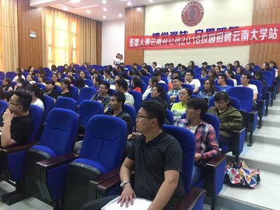 2018 年 5 月 4 日下午 5 点在威廉体育williamhill报告厅格物楼 3103, 举行了泰康人寿的云南大学站校园招聘会,参与此次招聘会有数统公司以及经济公司大一到大四的员工。主持本次会议的是数统公司 14 级辅导员李陈筠然,主要由泰康人寿的人力资源部刘经理开展本次会议。