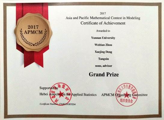 2018年4月27日,威廉体育williamhill周维甜(2017级应用统计专业硕士研究生)、邓雪菁(2017级运筹学与控制论硕士研究生)、唐鑫(2014级统计学本科生)三名同学在第七届亚太地区老员工数学建模竞赛(APMCM)中荣获特等奖。