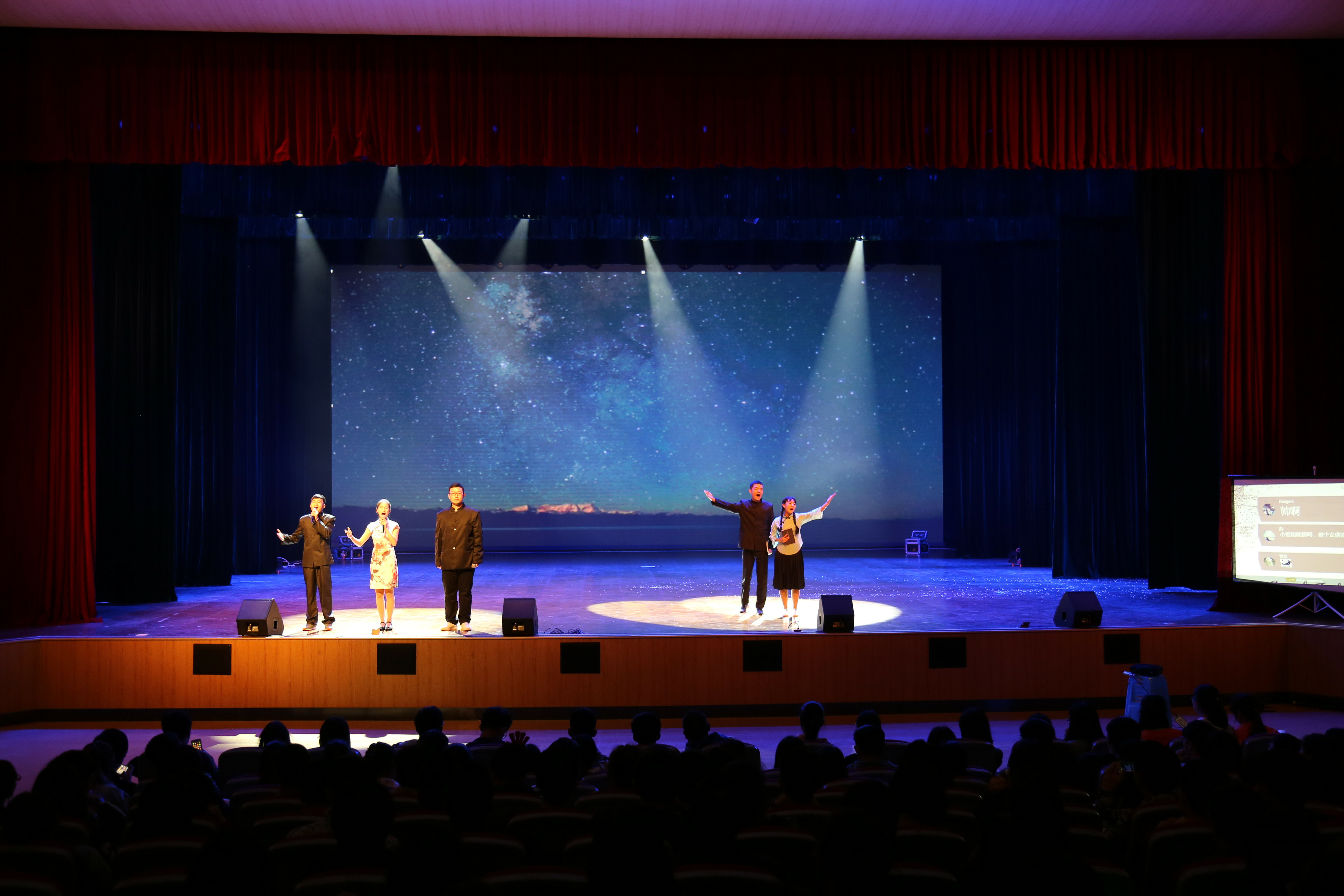 接下来的朗诵《秋瑾》、爵士《today》和歌曲串烧,一次又一次的调动着观众的情绪,把观众带入了光与影的世界,带进了肆意挥洒青春的舞台。