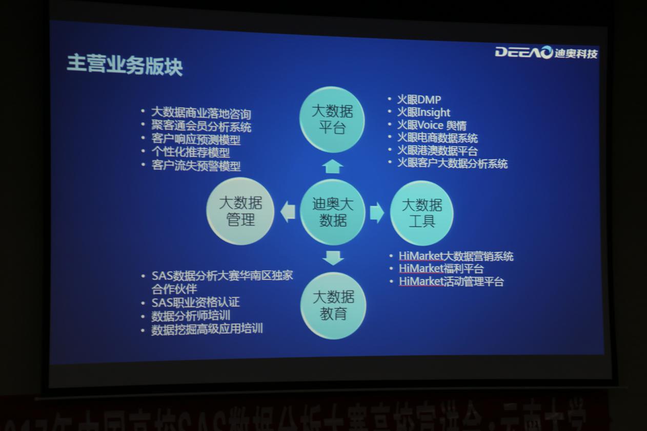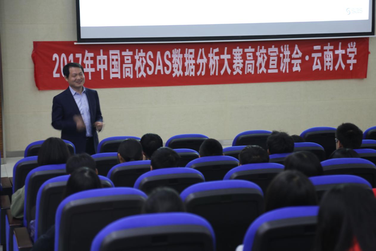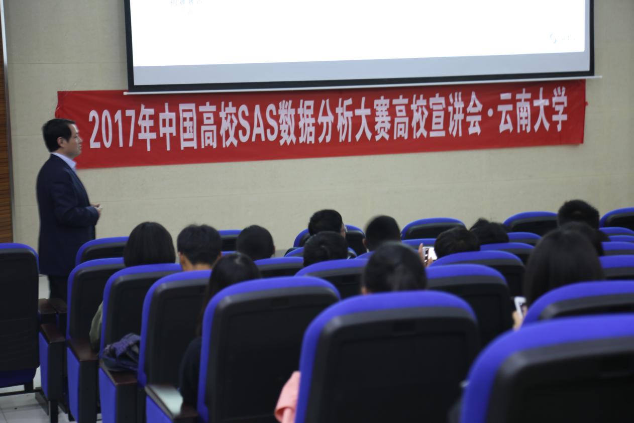 之后,赵老师向同学们介绍了“汇丰杯”中国高校SAS数据分析大赛并回顾了历届大赛,对2017年大赛的流程安排和奖项设置进行讲解。2017年大赛合作伙伴之一广州迪奥信息有限公司的员工方芳来到了宣讲会,向大家介绍了广州迪奥有限公司的主营业务板块以及SAS职业角色认证体系、SAS精英会和SAS大学-精英公司。