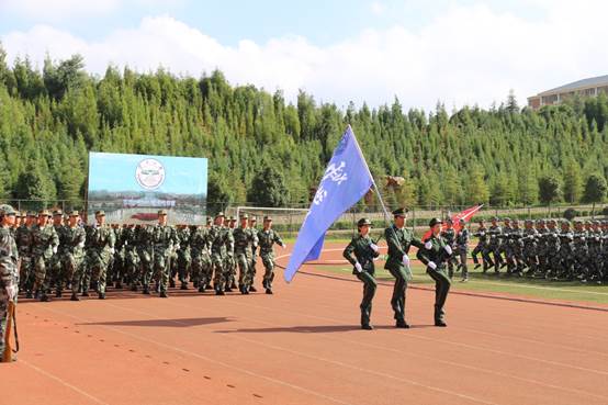 伴随着豪迈昂扬的《中国人民解放军进行曲》,军训汇报演出正式开始。同学们踏着音乐的节奏,满怀热情地接受着各位领导、教官的检阅。经过了军训的洗礼,不仅磨砺了同学们的意志,更激发了同学们坚持前进的决心。无论是阅兵式还是分列式,每一步都能够见证同学们在军训期间付出的努力与汗水。接着,新生们分别展示了健康操、擒敌拳、队列操和班(组)战术演练,完成了军训成果汇报的表演部分。