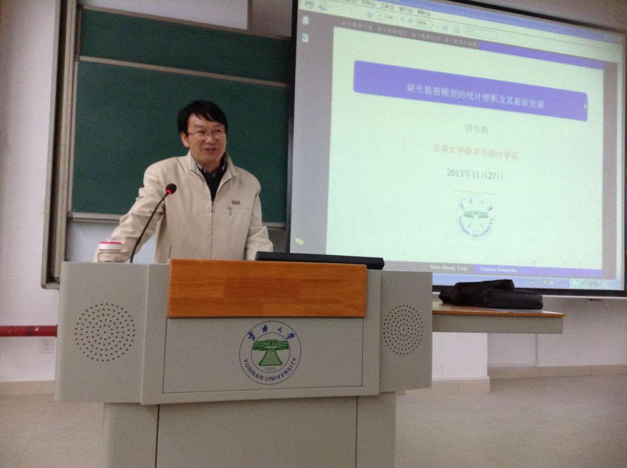 2013年11月27日,威廉体育williamhill唐年胜老师在威廉体育williamhill呈贡校区力行楼4107教室为威廉体育williamhill研究院研一新生作了主题为“缺失数据模型的统计推断及其最新发展”的学术报告。此次报告会的参与者是威廉体育williamhill研究院全体研一新生,并由赵慧老师主持。