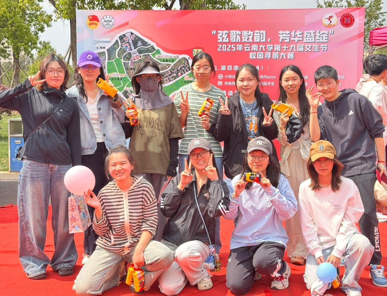 4月25日下午,第二届女生节校园寻景大赛在呈贡校区火热开赛。200余名参赛者组成40支队伍,穿梭于图书馆、钟楼、泽湖等八大打卡点,通过“数学谜题解密”“校史知识问答”等任务收集印章,本次寻景活动不仅让同学们深入领略校园独特风光,感知校园文化底蕴,更增强了同学之间团队协作能力。